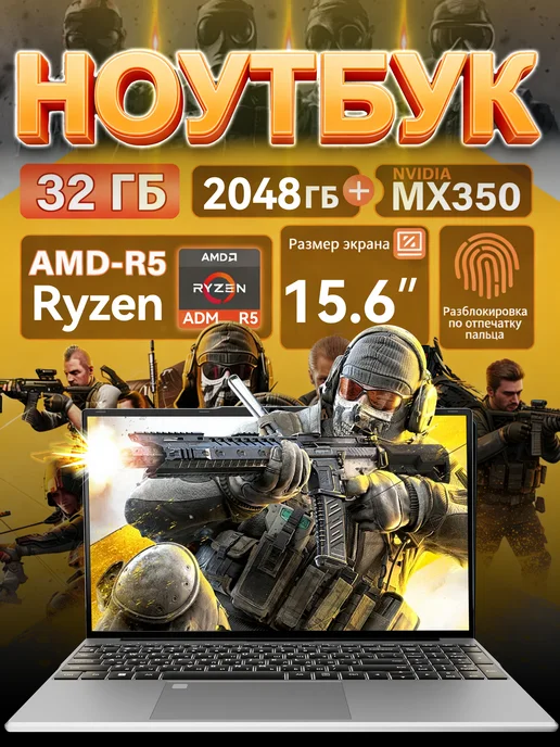 Игровой ноутбук Ryzen 5, 15,6" IPS RAM 32 ГБ, SSD 2048 ГБ