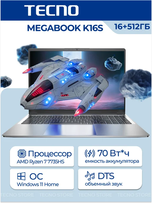 Tecno Megabook K16S Ноутбук 16", AMD Ryzen 7 7735HS, RAM 16 ГБ, SSD 1024 ГБ, AMD Radeon 680M, Windows Home, (4894947110832), серый, Русская раскладка