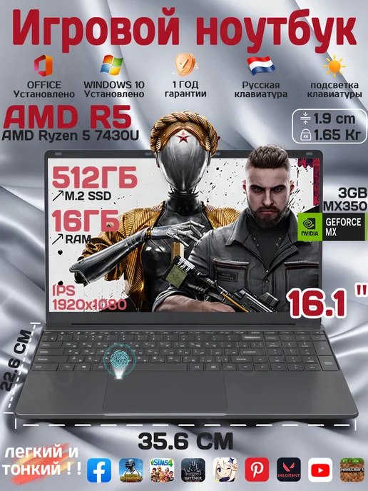 Ноутбук игровой AMD R5 16ГБ 512ГБ Мощный+Легкий 16.1"