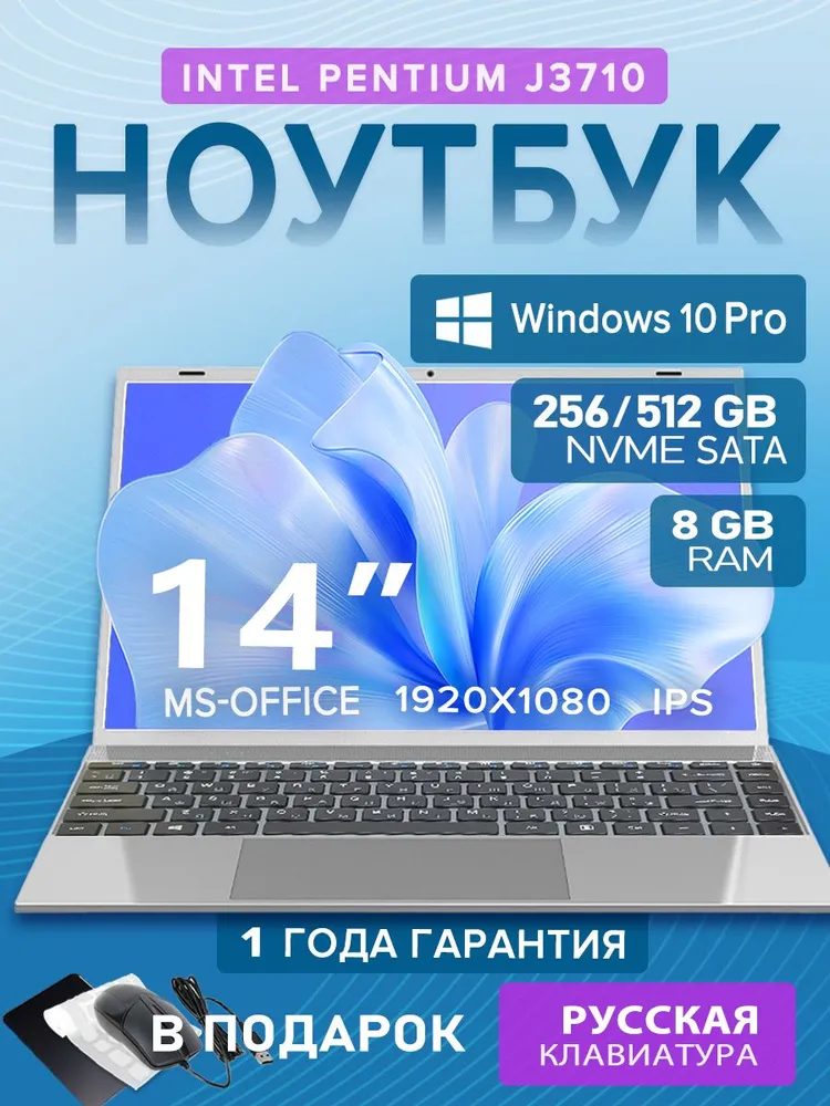 высокой производительности Ноутбук 14", Intel Pentium J3710, RAM 8 ГБ, SATA 256 ГБ, Intel HD Graphics , Windows Pro, серебристый, Русская раскладка Ноутбук 14", Intel Pentium J3710, RAM 8 ГБ 256 ГБ, AMD Radeon, Windows Pro, серебристый, Русская раскладка