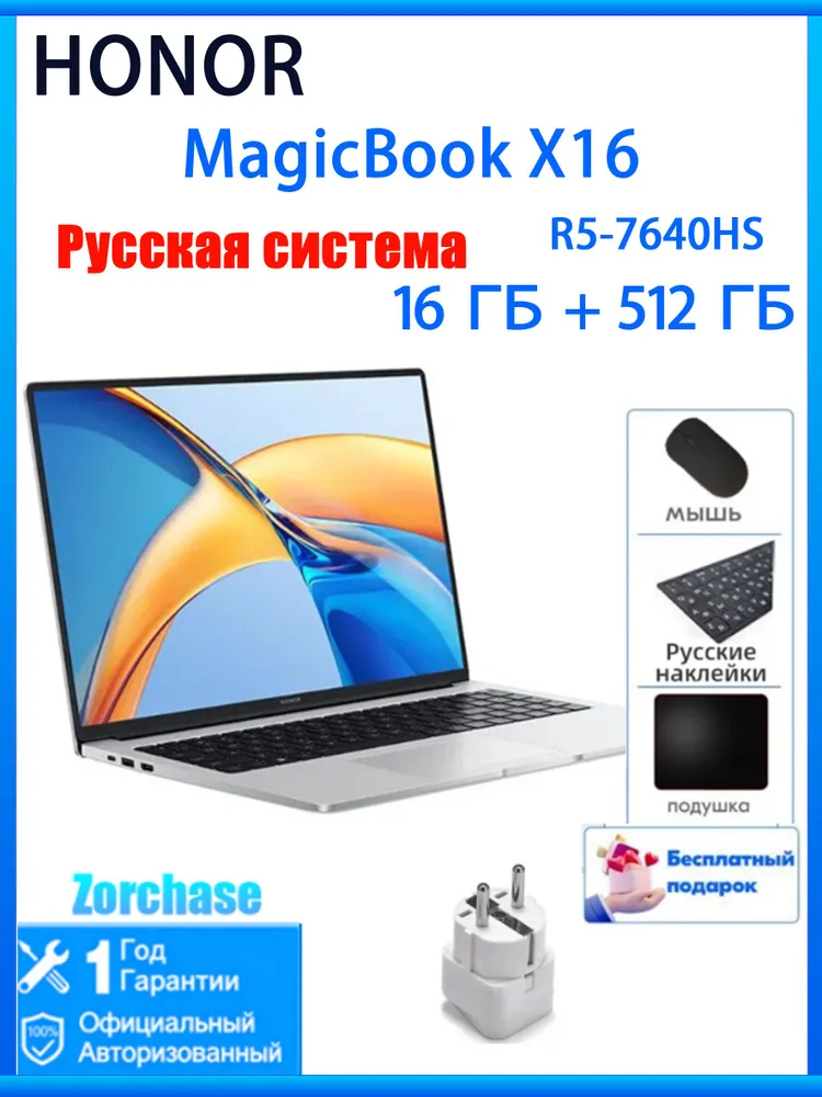 Honor Ноутбук MagicBook X16,AMD Ryzen 5 7640HS Radeon 760M Портативный компьютер Ноутбук 16", RAM 16 ГБ, SSD 512 ГБ, AMD Radeon 760M, белый, серебристый, Английская раскладка