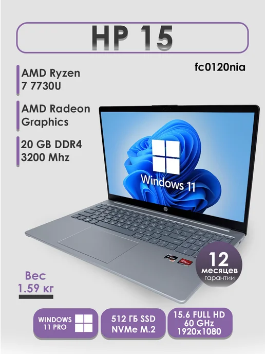 Ноутбук для работы и учебы 15-FC0120NIA AMD Ryzen 7 7730U
