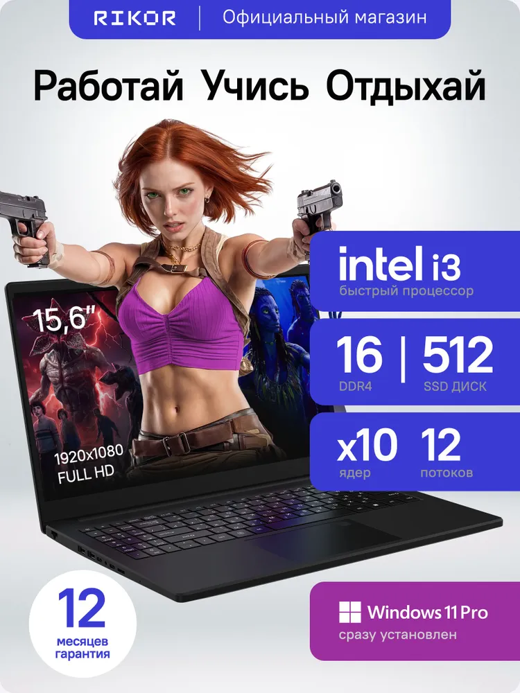 Rikor NINO 203.1 Ноутбук 15.6", Intel Core i3-1220P, RAM 16 ГБ, SSD 512 ГБ, Intel Iris Xe Graphics, Windows Pro, (8EFA0986), черный матовый, Русская раскладка