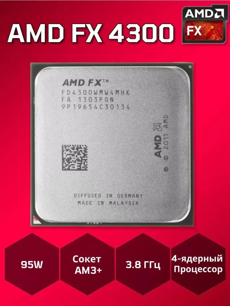 AMD Процессор FX-4300 AM3+, 4/4 до 3,8 ГГц, 2xDDR3 1866 BOX (без кулера)