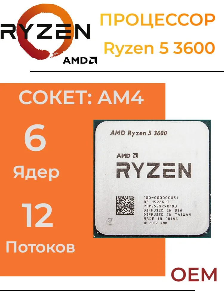 Процессор AMD Ryzen 5 3600 AM4, 6/12 до 4.2 ГГц, 2xDDR4 3200, без графики, OEM (без кулера)