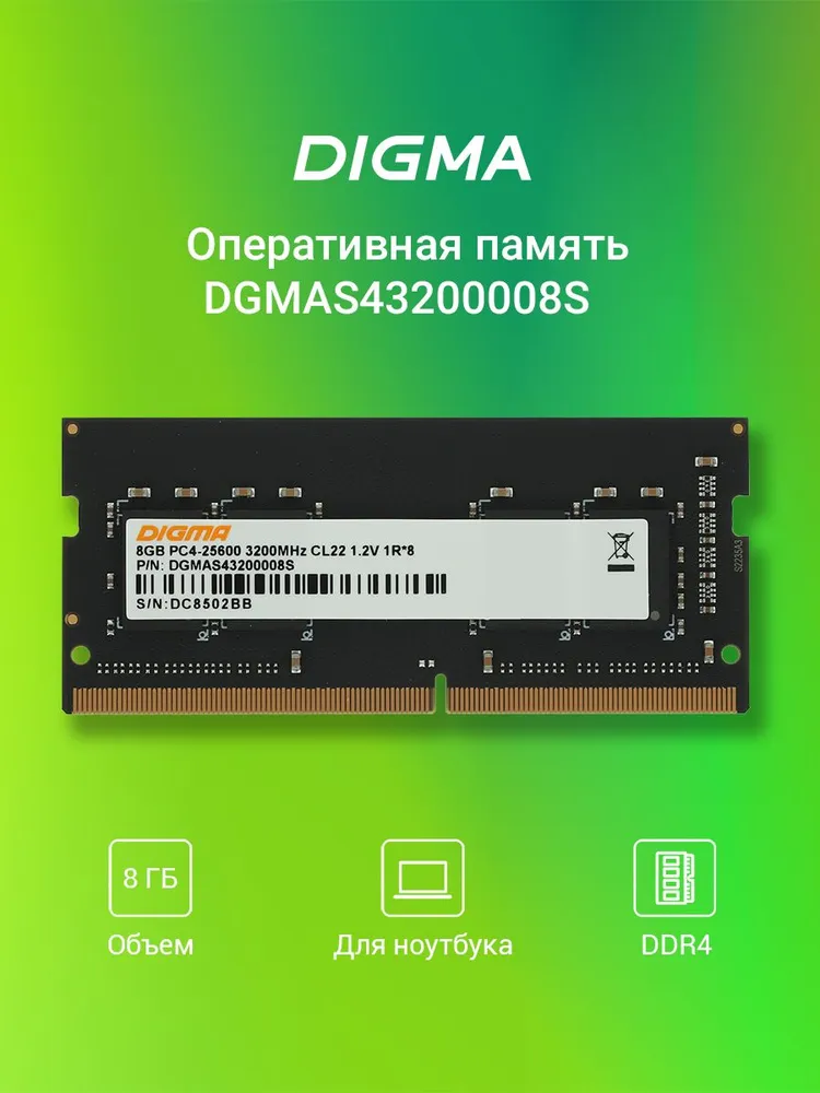 Digma Оперативная память PC4-25600 CL22 SO-DIMM 260-pin 1.2В 1x8 ГБ (DGMAS43200008S)