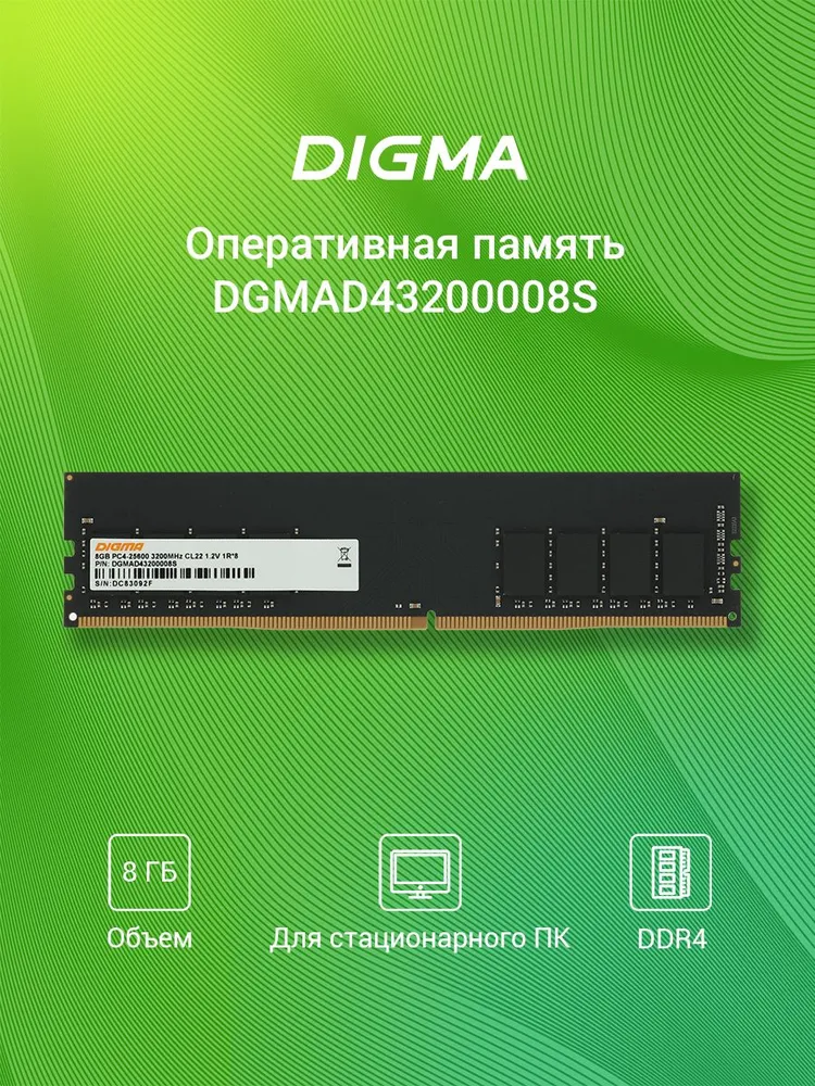 Digma Оперативная память DIMM DDR4 3200МГц PC4-25600 22-22-22-52 1x8 ГБ (DGMAD43200008S)