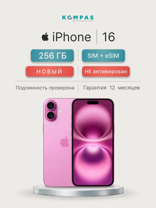 Смартфон iPhone 16 256 ГБ, SIM+eSIM, Розовый (Pink)