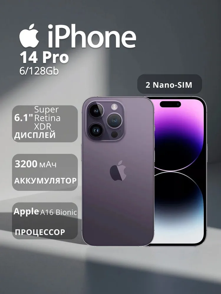 Apple Смартфон iPhone 14 Pro (Dual Sim) MQ0D3 Global 6/128 ГБ, фиолетовый