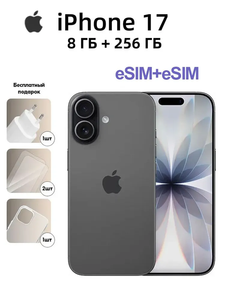 Apple Смартфон iPhone 17 (eSIM+eSIM) Поддержка русского языка Бесплатный подарок "Зарядное устройство PD мощностью 20 Вт + стеклянная пленка + прозрачный силиконовый чехол" 8/256 ГБ, черный