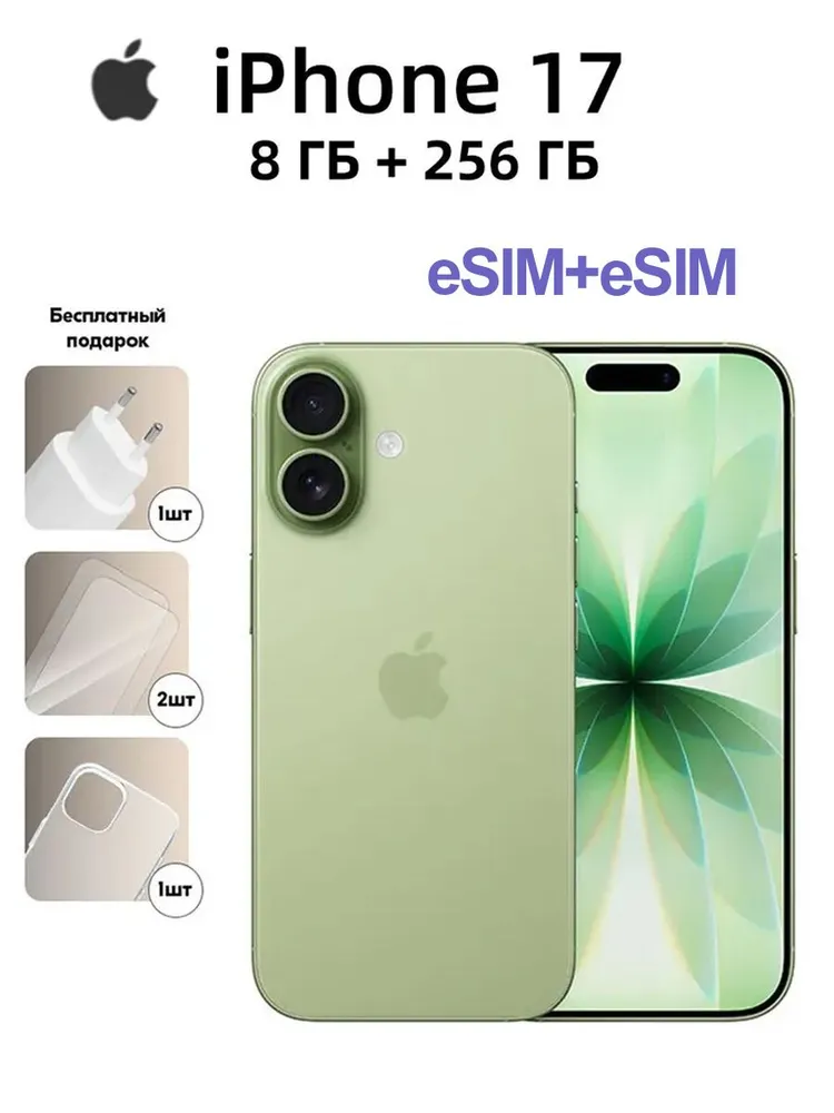 Apple Смартфон iPhone 17 (eSIM+eSIM) Поддержка русского языка Бесплатный подарок "Зарядное устройство PD мощностью 20 Вт + стеклянная пленка + прозрачный силиконовый чехол" 8/256 ГБ, зеленый