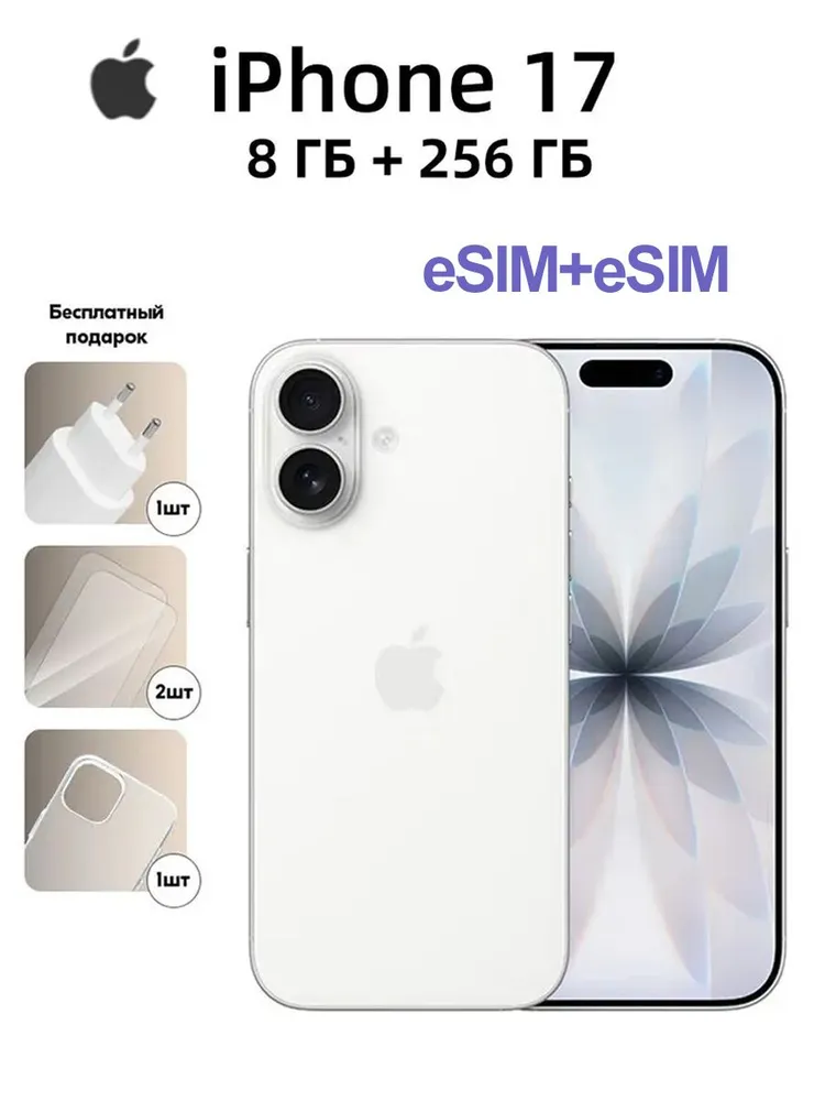 Apple Смартфон iPhone 17 (eSIM+eSIM) Поддержка русского языка Бесплатный подарок "Зарядное устройство PD мощностью 20 Вт + стеклянная пленка + прозрачный силиконовый чехол" 8/256 ГБ, белый