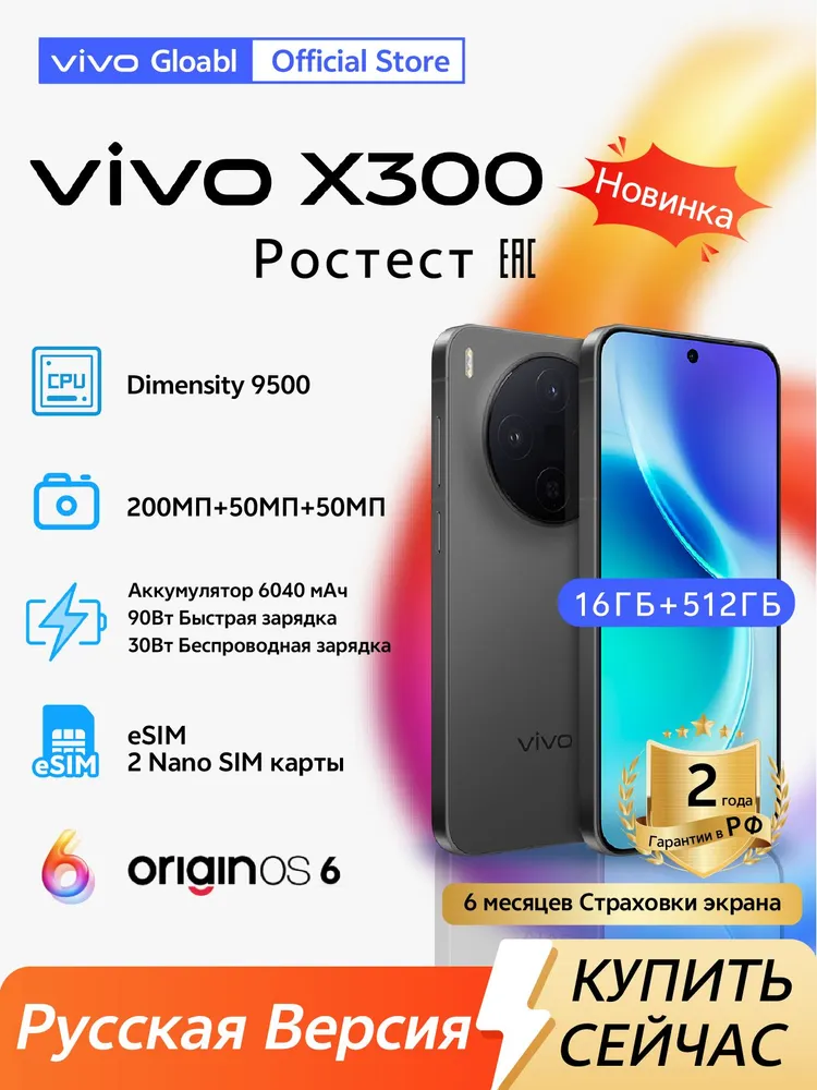 vivo Смартфон Vivo X300 (Русская версия ) 5G NFC + Dimensity 9500 + 200 Мп OIS Основная камера + 6040 мАч Аккумулятор + 90 Вт Быстрая зарядка + 6,31 дюйма 120 Гц AMOLED Ростест (EAC) 16/512 ГБ, черный матовый