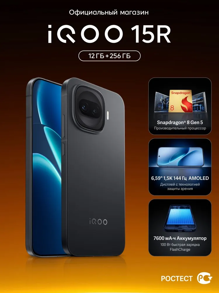 iQOO Смартфон iQOO 15R Snapdragon 8 Gen 5, 144 Гц AMOLED, 7600мАч, 100 Вт Ростест (EAC) 12/256 ГБ, черный