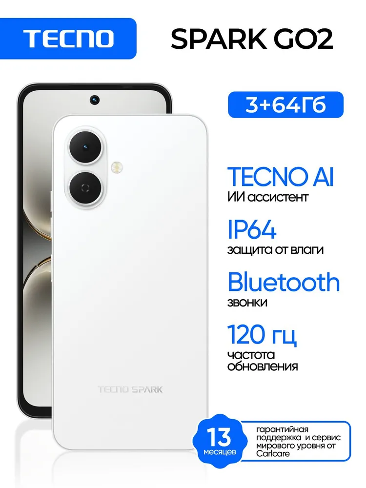 Tecno Смартфон SPARK GO 2 Ростест (EAC) 3/64 ГБ, белый