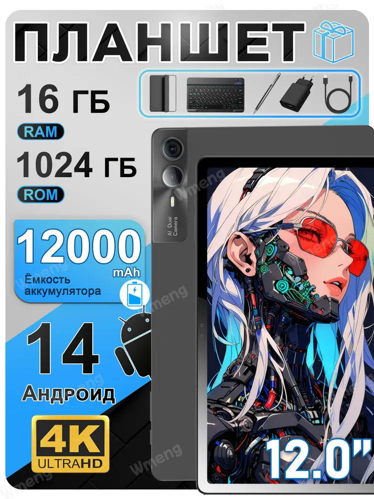 Wmeng Планшет Андроид 2026, 12" 16 ГБ/1024 ГБ, серый, темно-серый